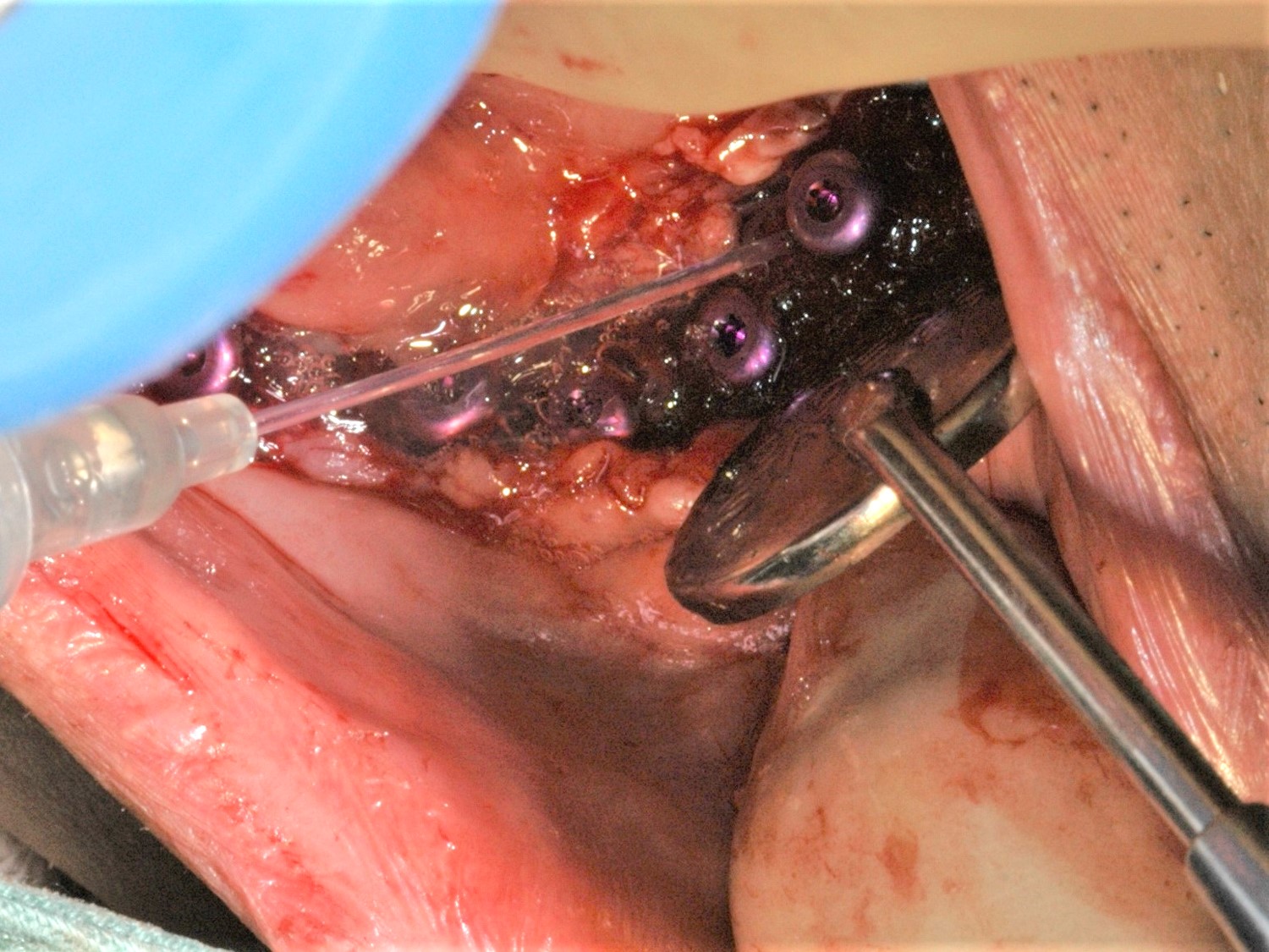 インプラント埋入から2か月後、インプラント周囲に歯槽提の固有歯肉を作成するために粘膜再生の手術を行った。口蓋より口蓋粘膜を移植することも考えたが、患者さんの負担が増えることと広範囲であり口蓋の粘膜をかなり広範囲で切除しないといけなくなることから、吸収性ポリグリコール酸フェルト ネオベール シートタイプ ネオベール(GUNZE)とベリプラスト 血漿分画製剤(生理的組織接着剤) フィブリノゲン加第XIII因子 を用いた再生法を選択した。なお、ペリプラストは血液製剤になるのでその旨、患者さんに説明し、十分な同意を得た上で使用した。