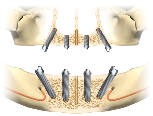 All on 4(オール・オン・フォー)は、もともと片顎14本(上下28本)あった歯の代わりを、下顎で4~6本、上顎で4~8本のインプラントを用い、片顎すべての歯をブリッジ形態で連結固定するインプラント治療の方法です。オールオンフォーはインプラント埋入本数を減らし、「患者様の肉体的、経済的負担を軽くする」画期的な術式となります。