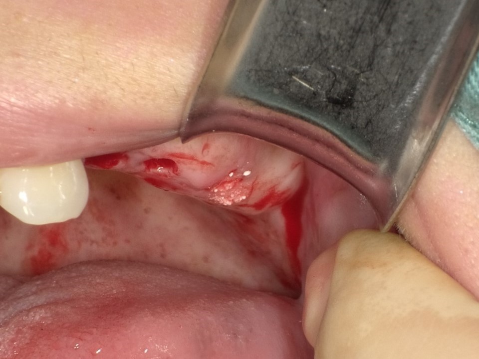 上記の症例に対し、右側では上顎洞の前壁から骨に窓開けを行って(ラテラルウィンドウテクニック)、その窓の部分から人工骨を上顎洞内に補填し、そこにインプラントを埋入するサイナスリフトを行った。